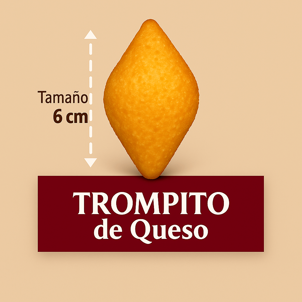 Trompitos (carimañola) de queso (25g). Disponible en bolsas por 35 unidades de 875 gramos.